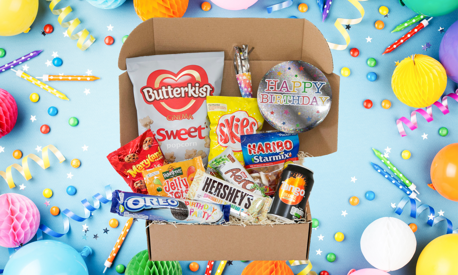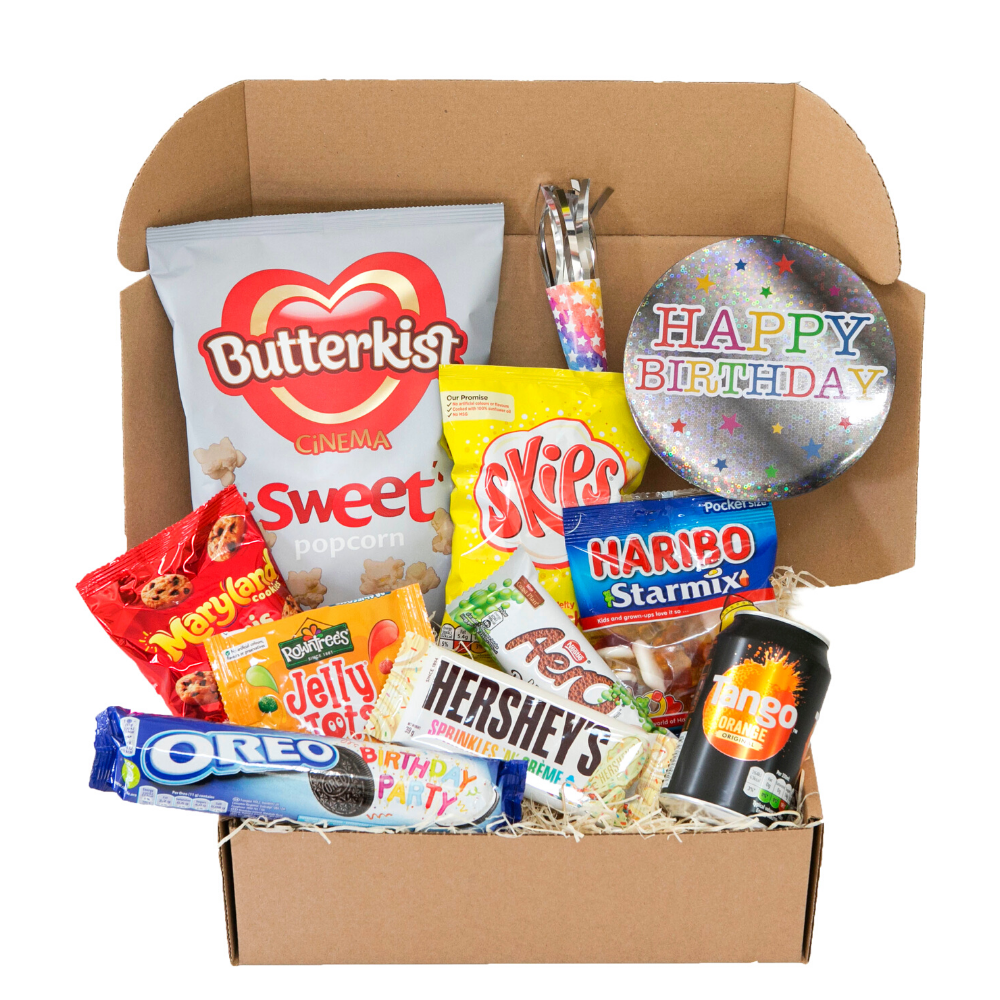 The Birthday Box is the perfect way to celebrate. As well as a selection of delicious party snacks. it contains a giant birthday badge. a party horn (yes. it’s as noisy as it sounds) and even Birthday Party Oreos!